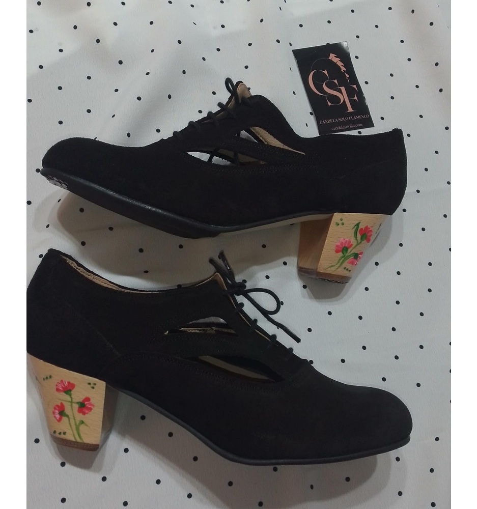 semiprofesional de ante negro con diseño alto de empeine ,aportando mucha sujecion,el tacon es cubano de 4,5 cm  lo que da estabilidad,lacado en madera clara y decorado con claveles.