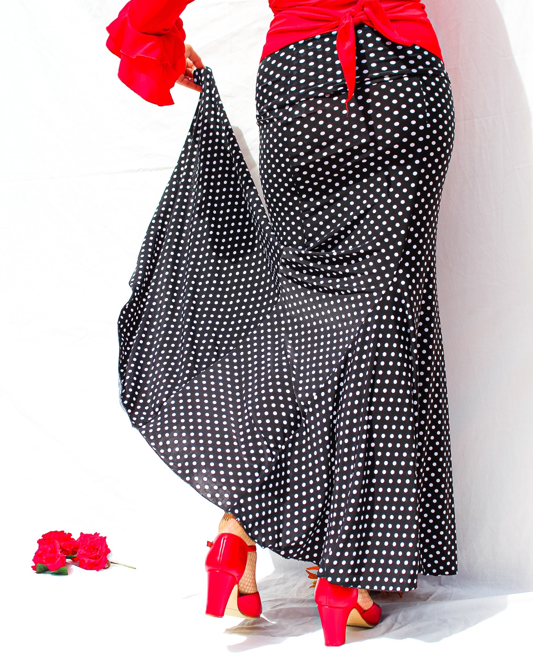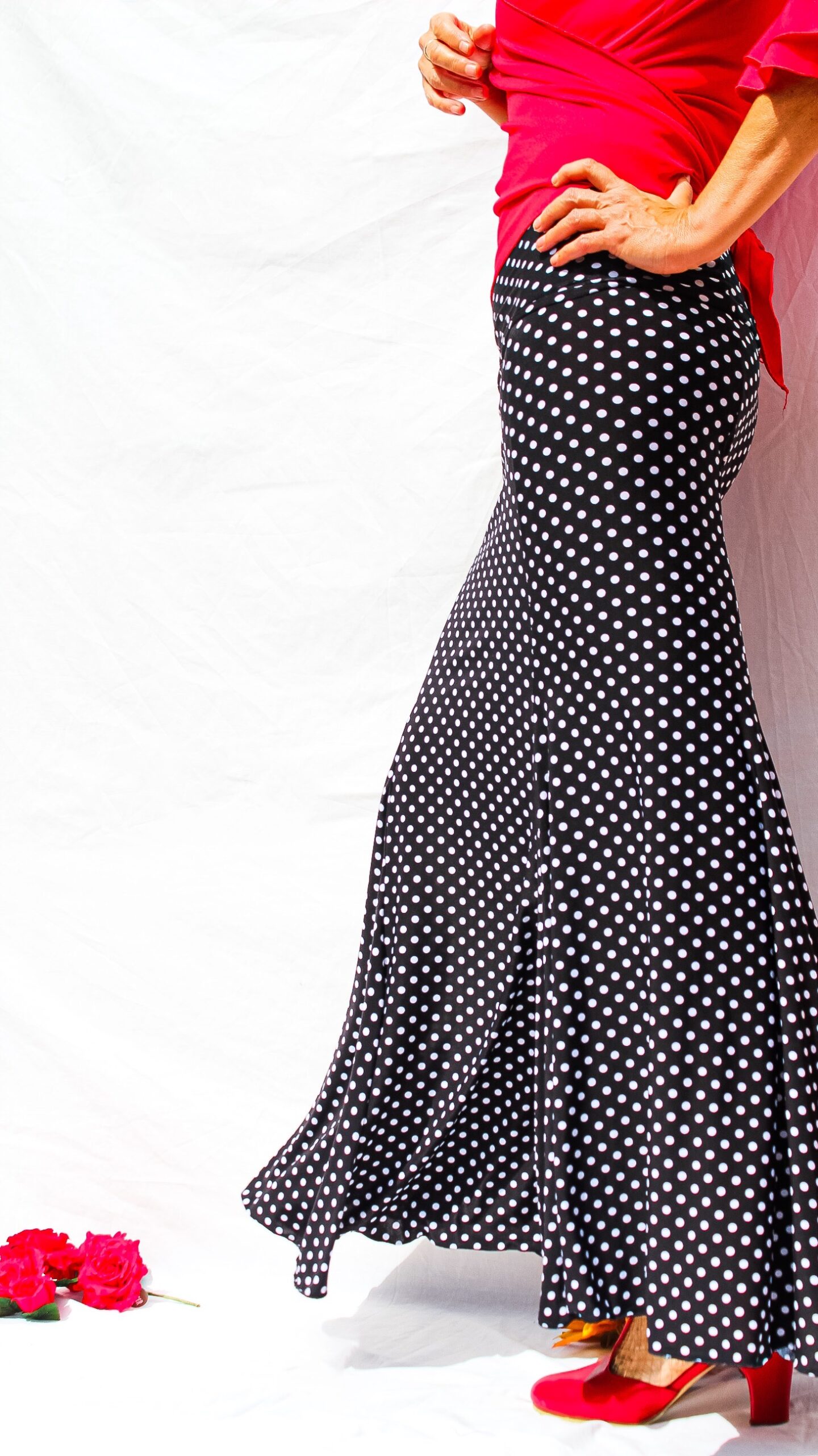 Es una falda ajustada a 40 cm de la cintura con cintura doble para ajustar el largo.