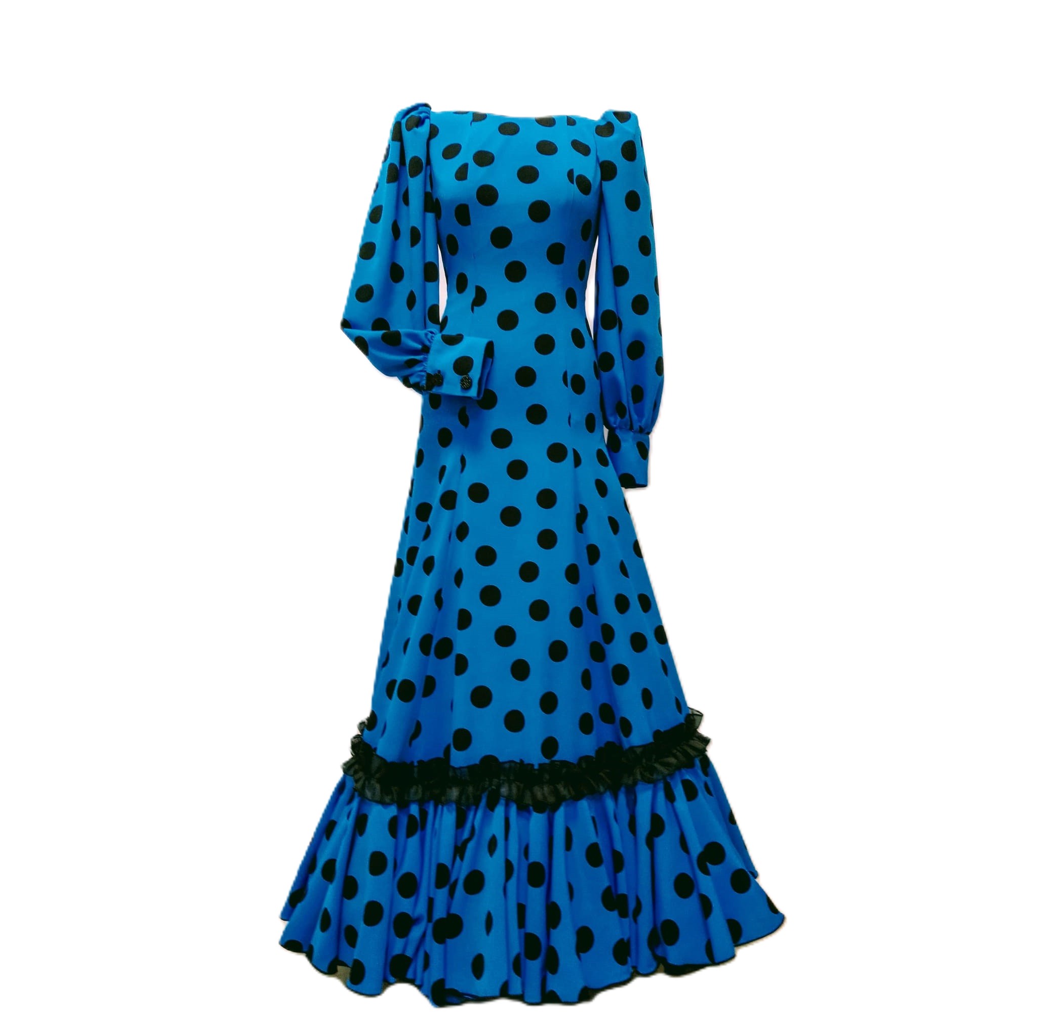 Vestido de crespón, forrado hasta la cadera con volante de cancán interior y carrucha de organza, mangas largas, con botones en el puño imitación azabache .Escote de pico en la espalda .Te o hacemos a medida